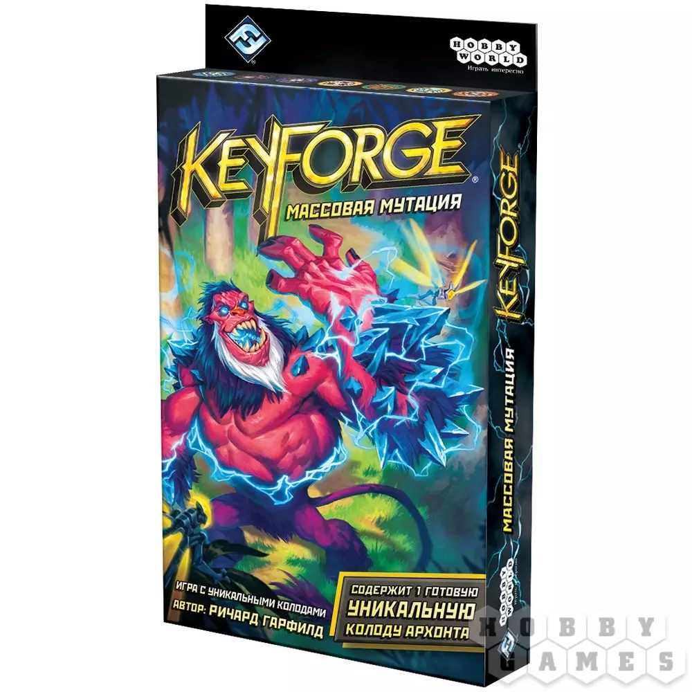 "Массовая мутация" – это четвёртый выпуск для уникальной карточной игры KeyForge, в котором каждая колода уникальна и неповторима. Вместе с "Массовой мутацией" в мир Кузни приходят свыше 200 новых карт, а также изменчивая сила тёмного янтаря, которая сделала привычных ранее существ непохожих на самих себя. Вас удивят и порадуют особые монстры, которые расположились на двух картах сразу, а также множество по-настоящему гигантских существ. Мутации по своей природе не являются добром или злом, и только вам решать, принять или презреть эти изменения.