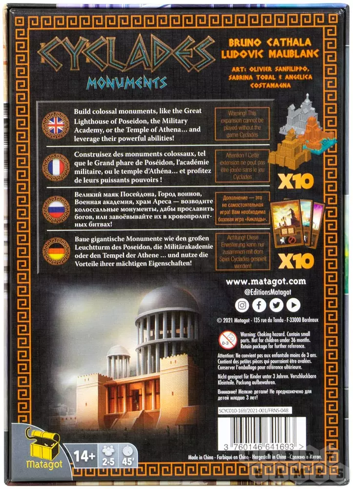 В определённый момент времени, с развитием цивилизации, люди начинают строить здания не только для определённых с практической стороны целей, но и чтобы ублажить свой эстетизм. И в дополнении "Киклады. Монументы" у вас тоже появится такая возможность. Вы будете не просто украшать свои территории величественными архитектурными шедеврами, но и получать за них вполне весомые бонусы. Какой-то монумент позволит восстановить или защитить войско, какой-то позволит получать больше ресурсов. Что из этого вы будете строить – решать вам. Но, конечно, взять и вот так просто возвести монумент у вас не получится, для начала придётся выполнить определённые условия строительства (для каждого монумента они свои). И если выполните их первыми, вы получите колоссальное преимущество перед остальными игроками!