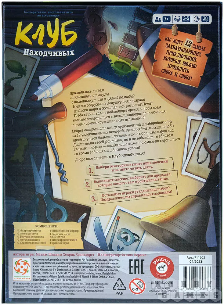 Какие только испытания не встречаются на пути отважных путешественников! Случалось ли вам сражаться с грозной акулой, вооружившись помадой для губ и утюгом? Или мастерить капкан для призрака шара для дискотеки и жвачки? Ещё нет?! Настал час собирать рюкзаки и отправляться на поиски приключений! Откройте книгу приключений и принимайтесь за первую миссию. К каждой миссии вы подбираете необычные предметы, которые помогут её успешно выполнить. Не сдерживайте свою фантазию! В игре нет единственного верного решения – придумайте его сами, даже если объяснение будет выглядеть безумным! Но и не забывайте о логике и здравом смысле – и ваша команда обязательно преодолеет все трудности и успешно пройдёт приключение!