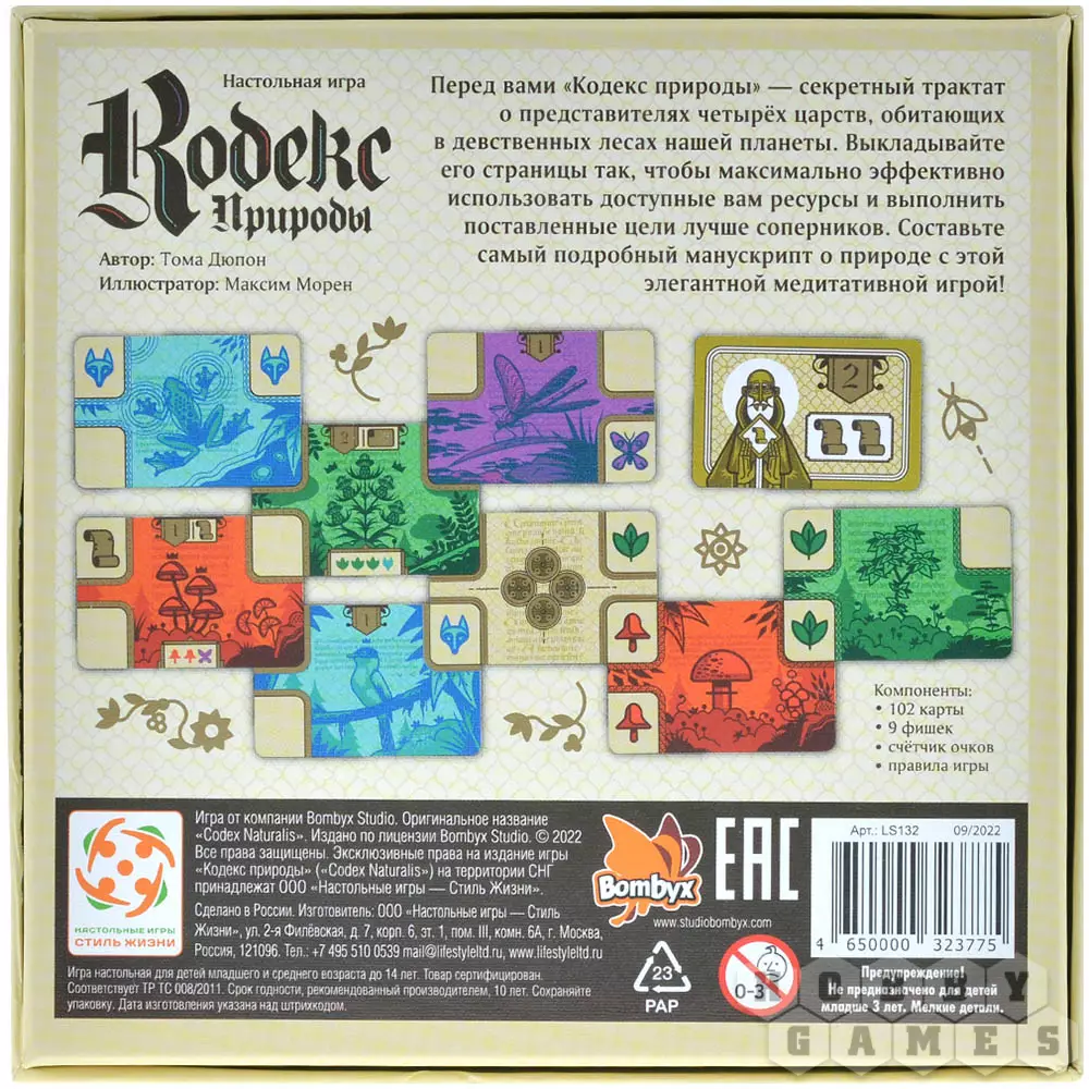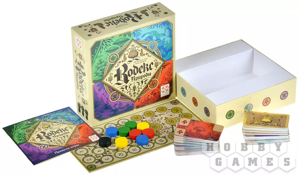 "Кодекс природы" – это абстрактная карточная игра, в которой вам предстоит создать лучшую страницу кодекса. Карты в игре делятся на ресурсные и предметные, которые, в свою очередь, разделены на виды. В игре 4 ресурса: растения, животные, грибы и насекомые. А предметов в игре всего 3 – это перья, чернильницы и манускрипты. Чтобы создать страницу, вы будете выкладывать карты в свою игровую область по определённым правилам: угол выложенной карты должен закрывать строго один угол хотя бы одной уже выложенной карты. Выкладывая всё новые и новые карты, вы будете получать доступ к ресурсам и предметам, которые в свою очередь будут открывать вам новые золотые карты, приносящие победные очки.