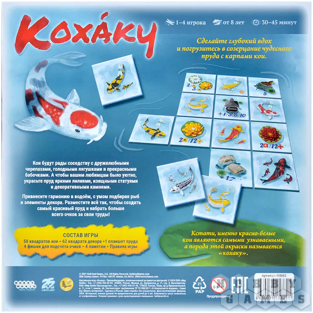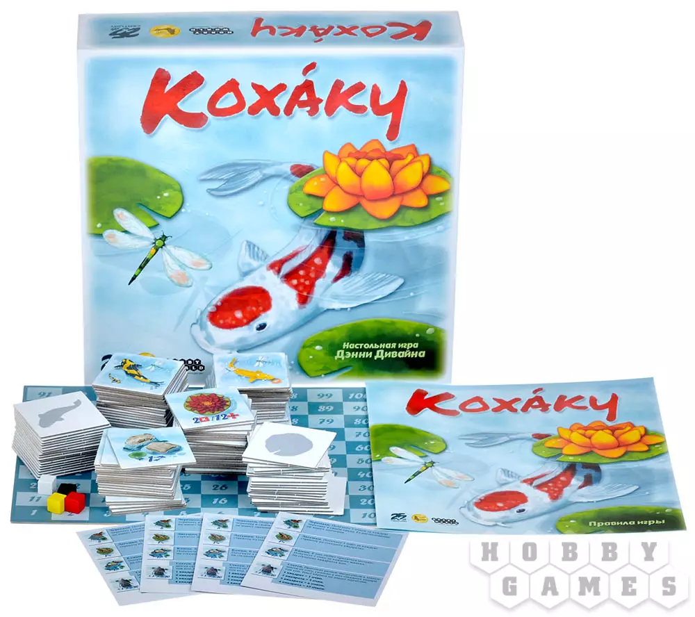 В настольной игре "Кохаку" вам предстоит создать собственный пруд. Поселить в нём одних только кои будет недостаточно, ведь эти рыбки любят соседство с другими водными обитателями: скрасьте их присутствие добрыми черепашками и лягушками, украсьте водную гладь прекрасными лилиями, а по берегам пруда установите красивые статуи. Игра соревновательная, каждый элемент вашего водоёма будет приносить победные очки, и чем гармоничнее вы будете размещать элементы, тем больше очков получите. Подходите с умом к подбору декоративных элементов и создайте самый красивый пруд!