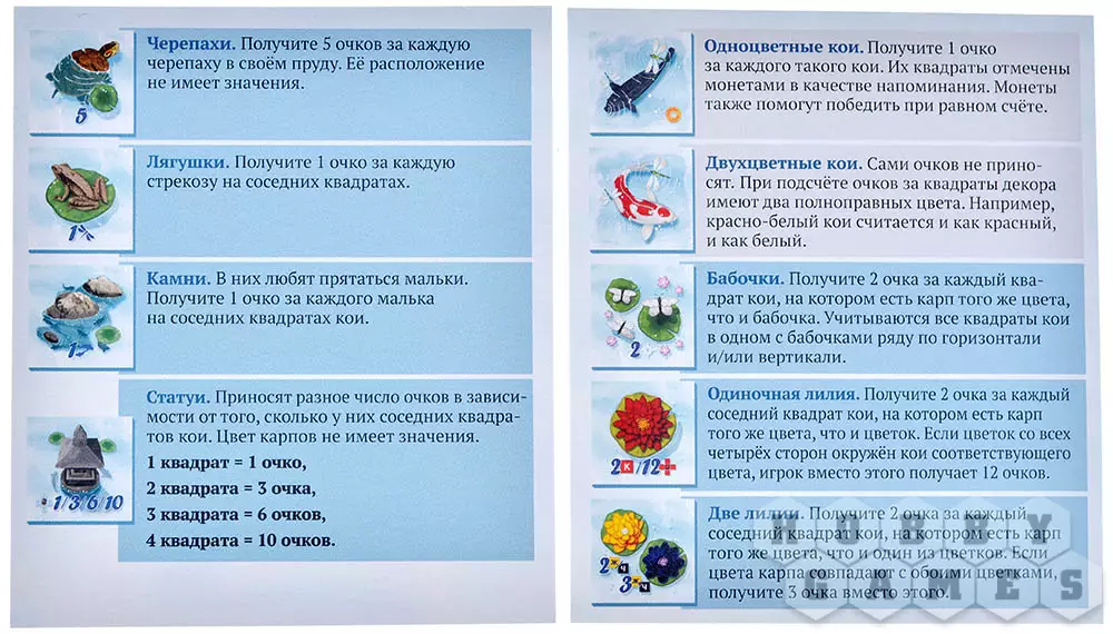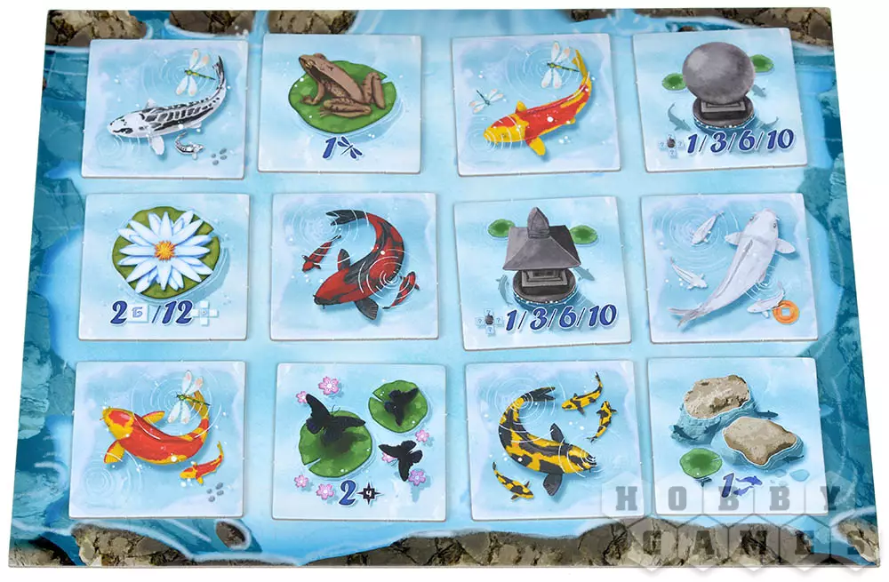 Игроки делают равное количество ходов, и игра заканчивается, когда вам нечем будет пополнить планшет пруда. Начинается подсчёт очков. Каждый квадрат вашего пруда и каждый выбранный элемент декора принесёт вам определённое количество очков. Тот, кто набрал больше всех очков выигрывает!