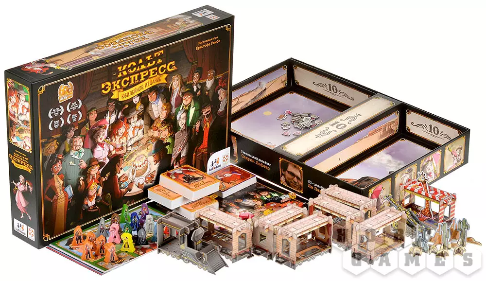 В эту коробку вошли базовая игра и полностью новое дополнение "Юбилей", которое приносит с собой два дополнительных вагона, уникальных персонажей, новые механики и усовершенствованные компоненты. Особое внимание заслуживают улучшенные деревянные жетоны, вагон-цирк, дрезина и фигурки бандитов, знакомых по классической версии и другим дополнениям серии.