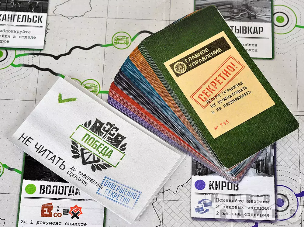 Задания делятся на главные и рядовые. Рядовые нужно выполнять, чтобы не допустить провала по времени и получить награды, а главные продвигают сюжет и требуют строгого выполнения условий в указанных городах. Для выполнения многих задач придётся проходить проверки: количество кубиков зависит от того, сколько ячеек в нужном отделе разблокировано, а успехи и неуспехи влияют на стресс. Команда должна поддерживать друг друга, делиться ресурсами, помогать перебросами и использовать эффекты городов, чтобы в нужный момент усилить проверку или ускорить завершение задания. Каждый раунд – это маленькая стратегическая головоломка, где важен как общий план, так и своевременные импровизации.