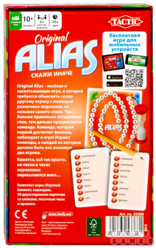 Alias – всемирно известная словесная серия игр, в которой насчитывается уже десятки различных версий и вариантов, как для самых маленьких, так и для взрослых компаний. Цель игры предельно проста и заключена в самом названии игры, ведь Alias означает "также известный как"… Команды, чтобы заработать победные очки, должны будут объяснять загаданные слова посредством использования любых других, но не однокоренных. Также обычно запрещается использовать аналоги на иностранных языках, зато разрешается и поощряется включение пантомимы и приведение самых невероятных аналогий для объяснения нужного вам слова. Но самое пикантное в игровом процессе то, что время поджимает, а чем больше вы успеете отгадать слов, тем дальше продвинется ваша команда… В общем, будем шумно и весело "Говорить иначе"!