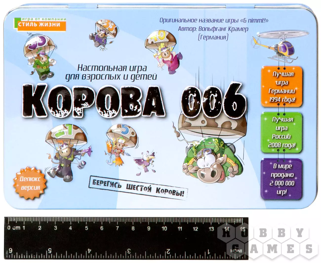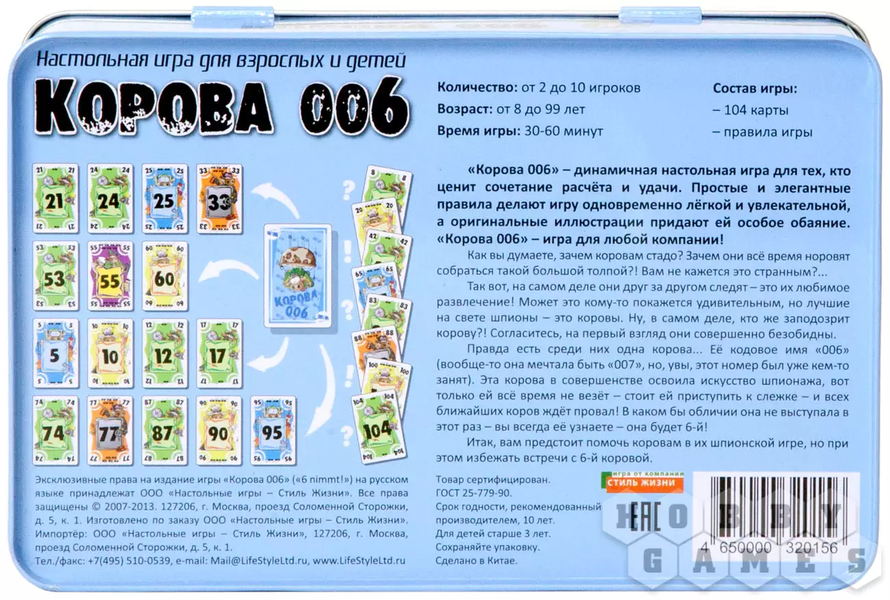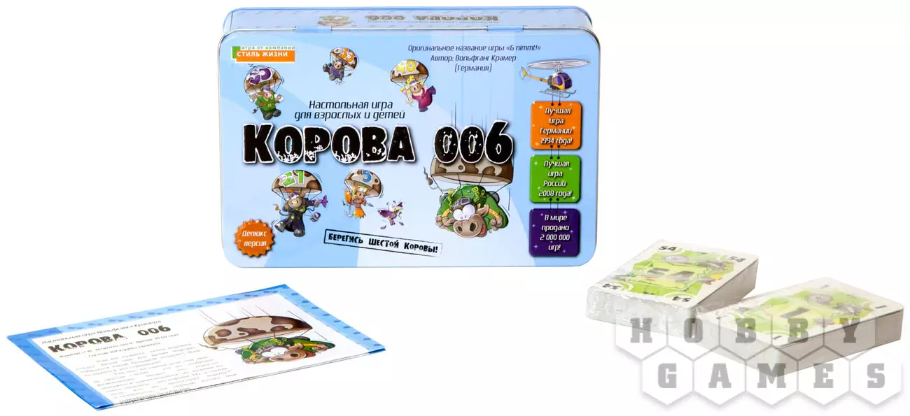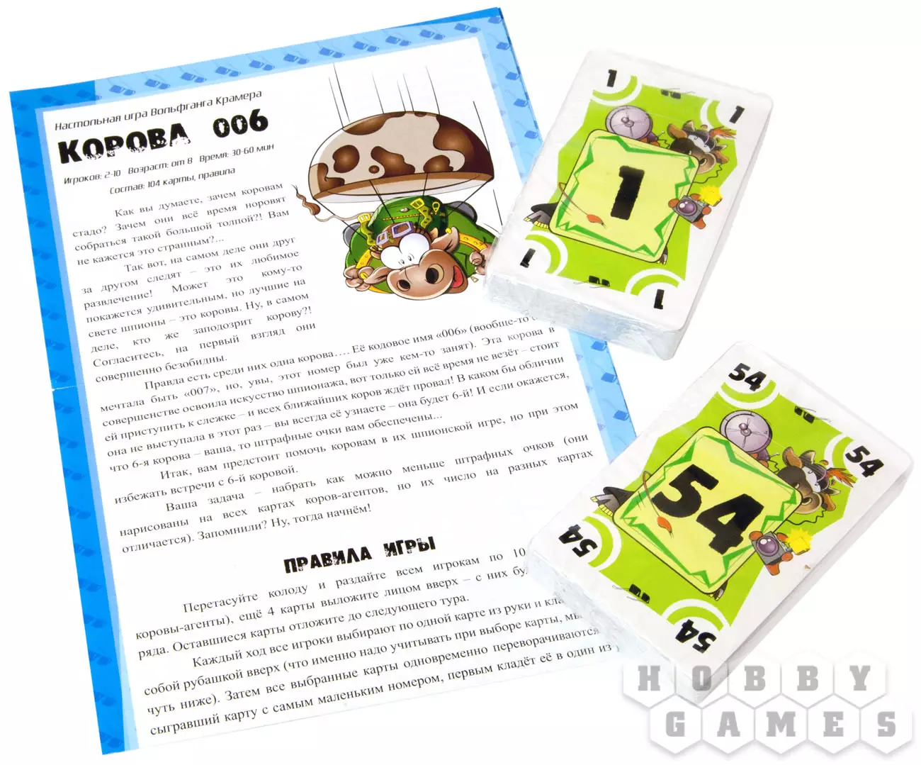 Лёгкая и увлекательная настольная карточная игра, отлично подходящая как для семейного круга, так и для весёлой дружеской компании. В ней вам предстоит стать участником шпионской игры… среди коров! Верно оценивая ситуацию и предугадывая действия других игроков, вам надо будет ввести всех своих коров-шпионов в игру так, чтобы избежать встречи с невезучей шестой коровой и набрать как можно меньше штрафных очков.