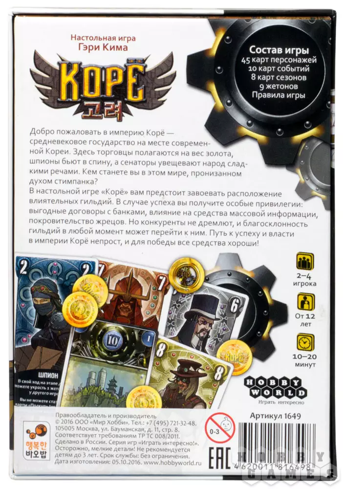 "Корё" – карточная настольная игра, в которой вам предстоит бороться за расположение гильдий. При успехе вам обеспечено место под солнцем: средства массовой информации у вас в кармане, банки предлагают вам выгодные сделки, жрецы покровительствуют вам и возносят молитвы в вашу честь... Однако конкуренция высока, а гильдии непостоянны в своем выборе. Обрести власть и почёт в Корё нелегко, здесь цель оправдывает средства – значит, можно добиваться победы любой ценой!