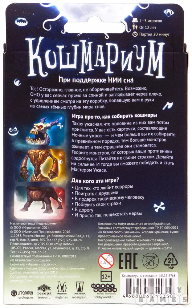 Caine30.10.2020 13:08Игра простая в освоении, не требует подготовки. Играем всей семьей вместе с ребенком. Упаковка компактная, можно взять с собой куда угодно. Оформление понравилось, арты красочные и забавные. Ранее читали комментарии, что дети путают, какого монстр цвета, но эту проблему легко решает правильна ориентация карточек, чтобы все обозначения были с одной стороны, соответственно там и цвет. Покупкой довольны, она полностью оправдывает затраченные средства. -