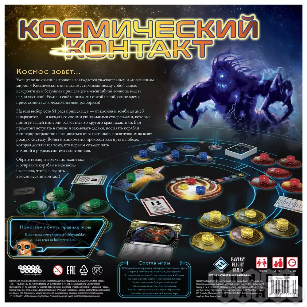 "Космический контакт" – стратегическая игра о межпланетных разборках, которая уже давно обрела культовый статус и завоевала сердца сотен фанатов. Если вы ещё не успели познакомиться с очаровательным и динамичным миром "Космического контакта", то самое время обратить внимание на новое, юбилейное издание легендарной настольной игры и принять участие в уникальном состязании за власть над галактикой!