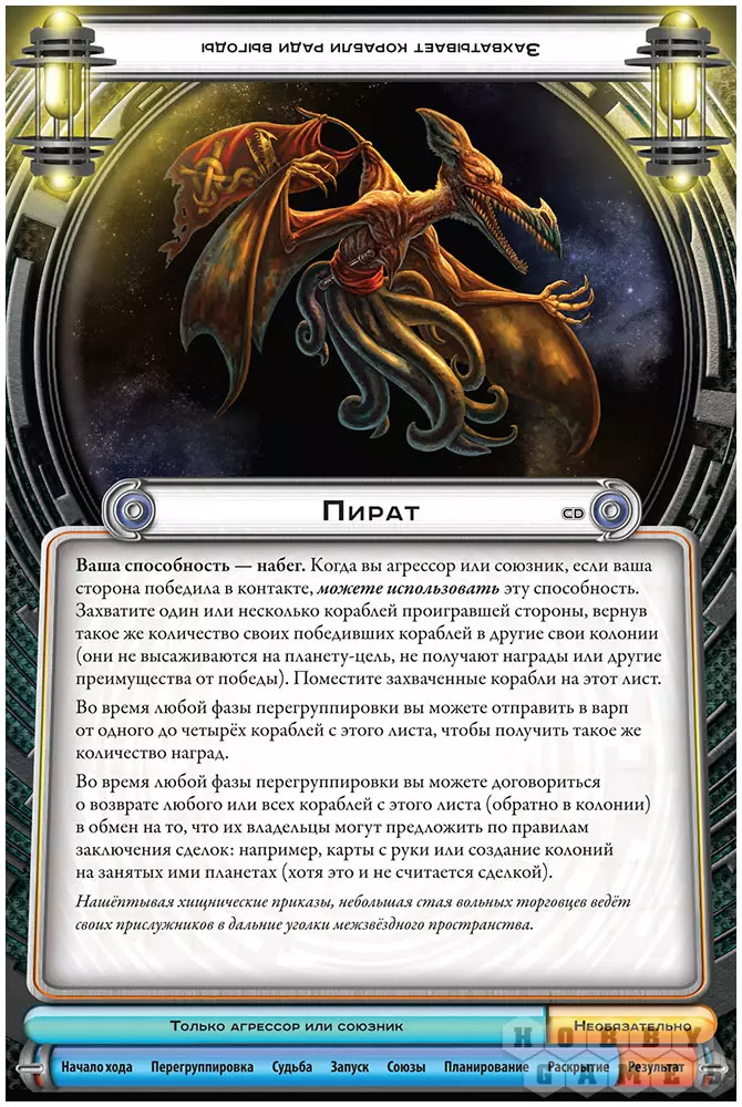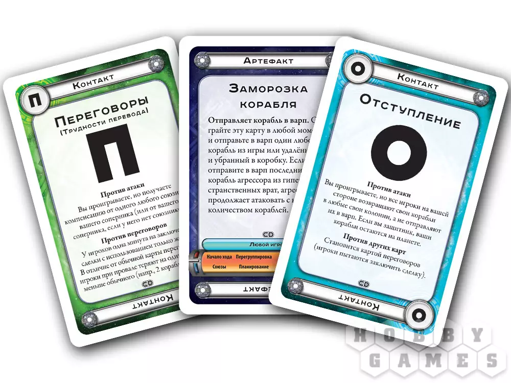 Затем из карт замешиваются колода судьбы и космическая колода. Посреди стола располагается Варп со шкалой для счётчиков далёких колоний. Теперь всё готово для начала первого хода: эта честь может быть отдана, например, самому молодому из участвующих игроков. Совершающий ход игрок именуется Агрессором.
