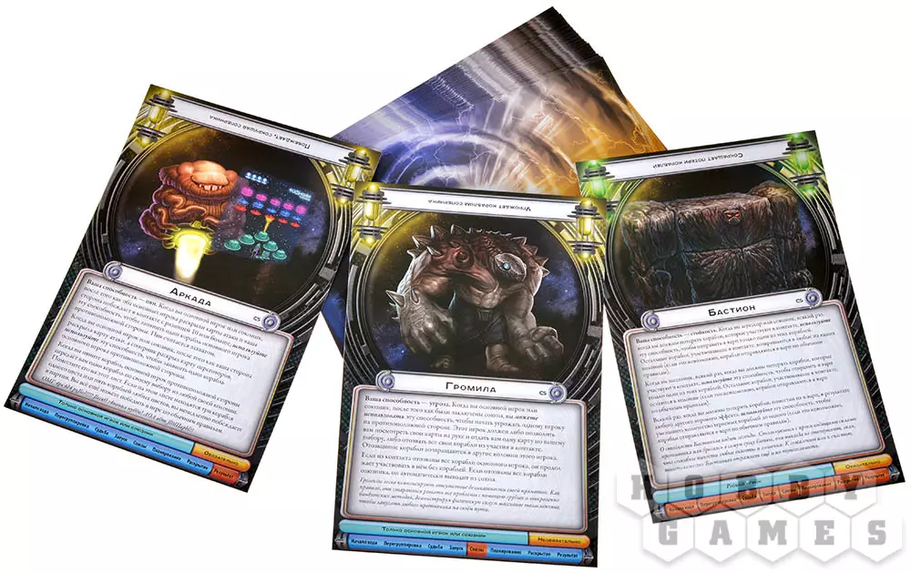 Затем из карт замешиваются колода судьбы и космическая колода. Посреди стола располагается Варп со шкалой для счётчиков далёких колоний. Теперь всё готово для начала первого хода: эта честь может быть отдана, например, самому молодому из участвующих игроков. Совершающий ход игрок именуется Агрессором.