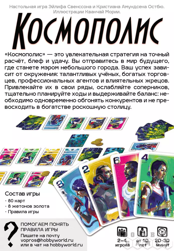 "Космополис" – это увлекательная стратегия на точный расчёт, блеф и удачу. Вы отправитесь в мир будущего, где станете мэром небольшого города. Ваш успех зависит от окружения: талантливых учёных, богатых торговцев, профессиональных агентов и влиятельных жрецов. Привлекайте их в свои ряды, ослабляйте соперников, тщательно планируйте ходы и выдерживайте баланс: необходимо одновременно обгонять конкурентов и не превосходить в богатстве роскошную столицу.