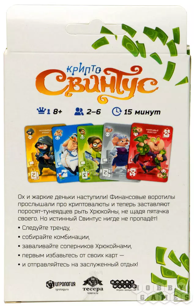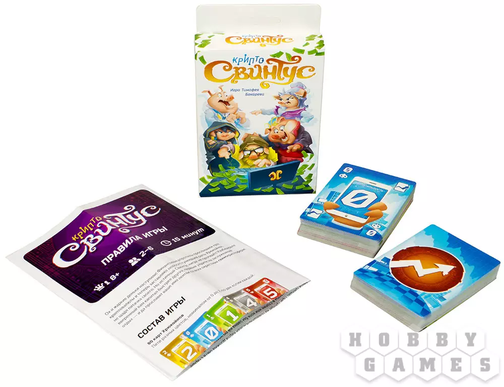 "Криптосвинтус" – это небольшое ответвление в известной серии игр "Свинтус". В соответствии с требованиями рынка криптовалют правила были несколько изменены, а вот задача перед игроками стоит прежняя – быстрее всех избавиться от всех карт с руки. В остальном же это всё та же динамичная карточная игра, в которой нужно быстро думать и реагировать на действия других игроков. Игра отлично подойдёт тем, кому уже мало стандартного "Свинтуса", но хороша также и для знакомства с этой великолепной серией игр.