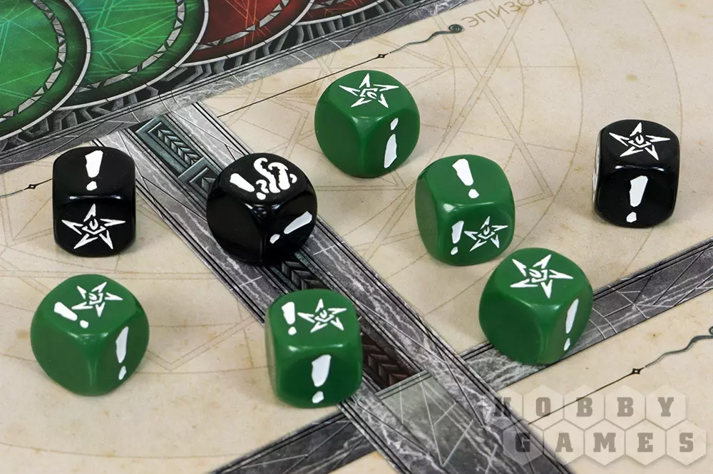 Для боевой части игры и для проверок используются кости, на гранях которых есть различные обозначения. Вы можете выкинуть успех, провал и другие значения. С этой механикой тесно связана ещё одна – чем дальше сыщик погружается в своё безумие, тем больше дополнительных костей бросает. В безумии сила!