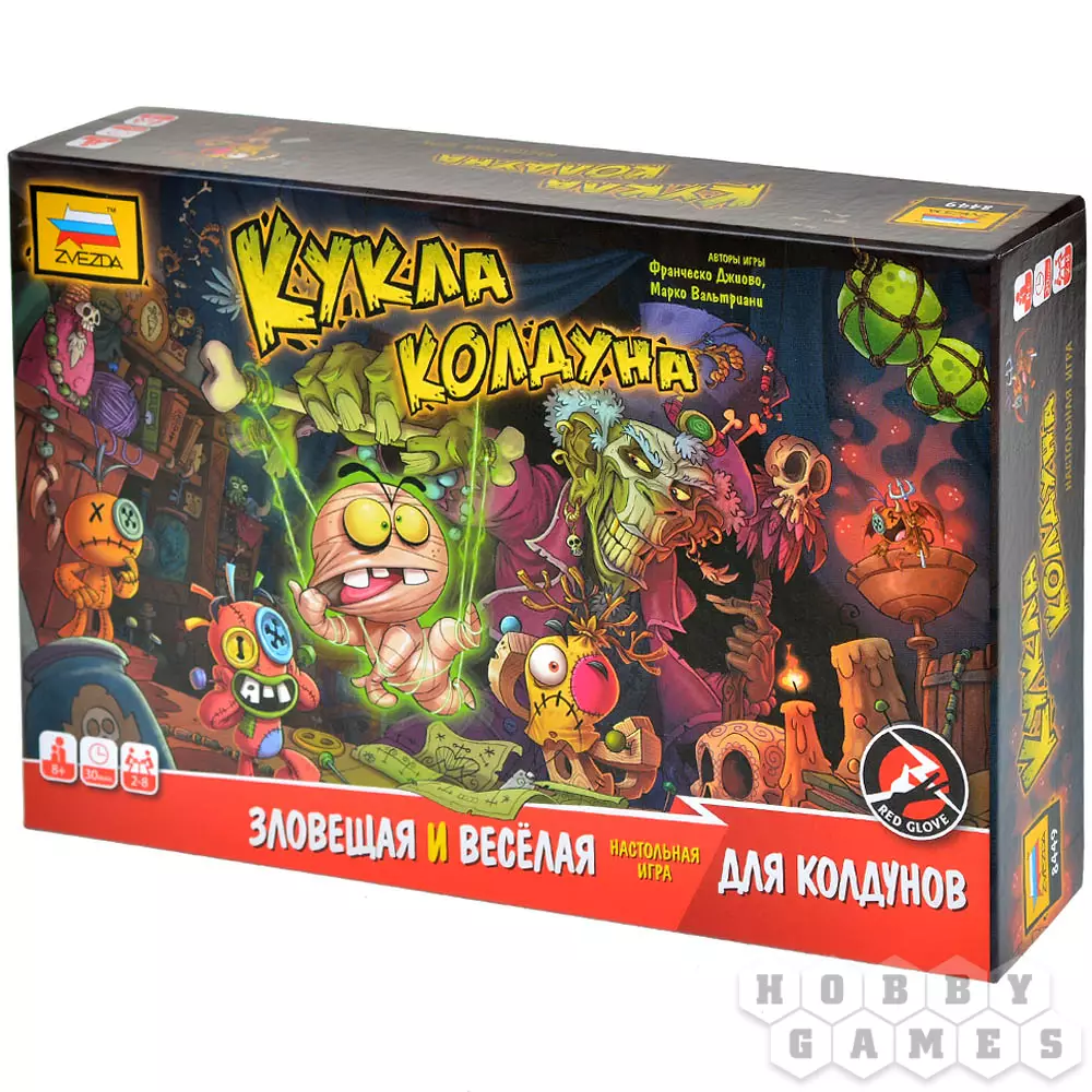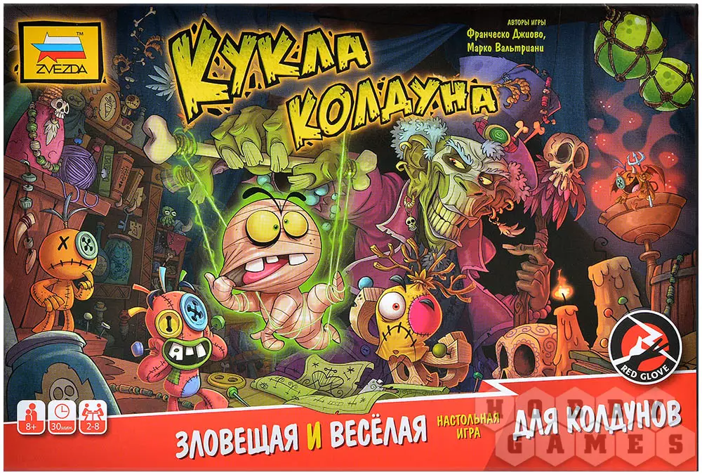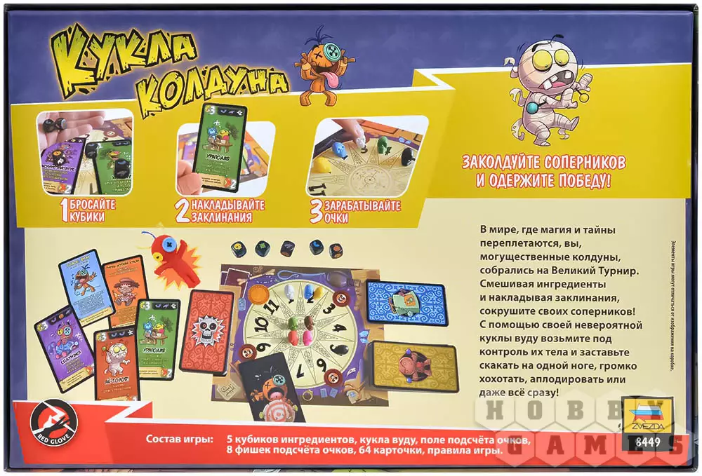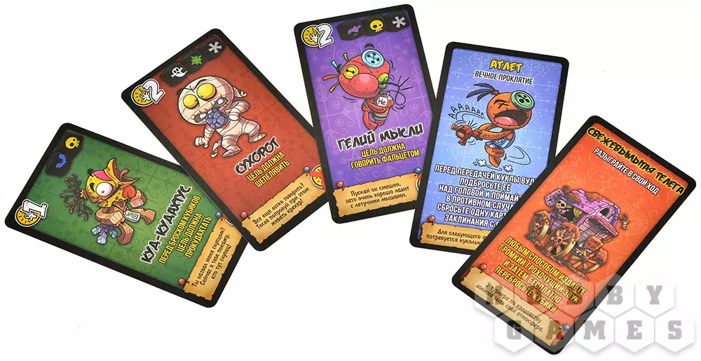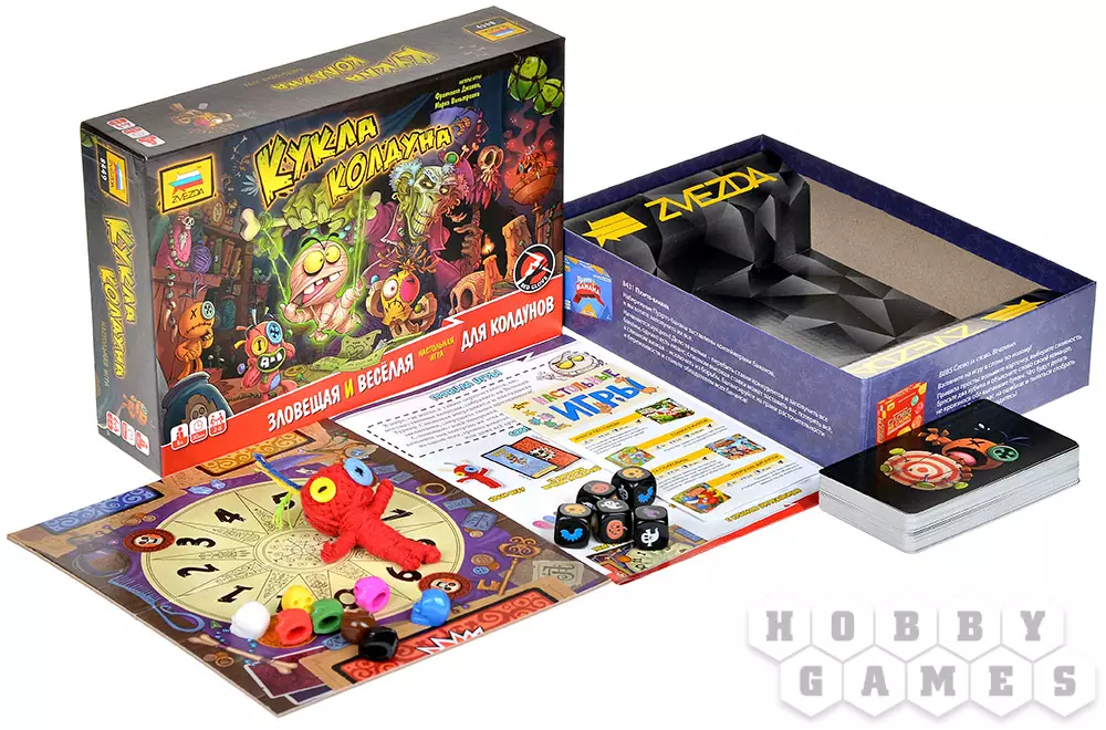 "Кукла колдуна" – весёлая игра, идеально подходящая для вечеринок. Она заставит игроков хорошенько подвигаться и посмеяться. Вы станете рабами чужих кукол вуду – а точнее, карт, – и будете выполнять выпавшие действия. Некоторые из них являются условием для получения каких-либо выгод, другие – затрудняют игровой процесс.