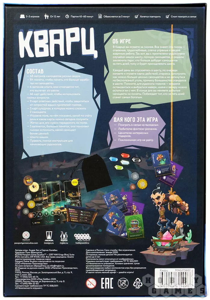 Гномы храбры, решительны, трудолюбивы и любят наслаждаться азартными играми. В настольной игре "Кварц" вы и другие гномы открываете новую неразработанную шахту, которая богата ценными кристаллами. В восторге от открытия вы решаете пойти на риск...
