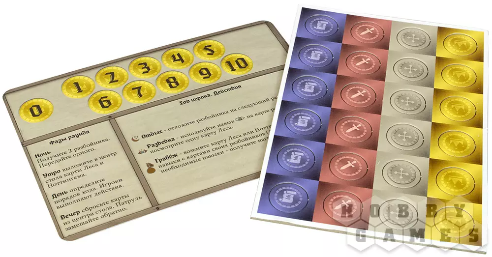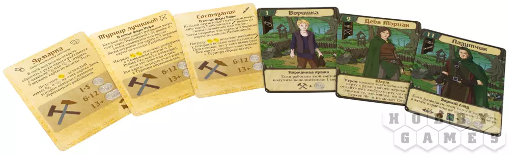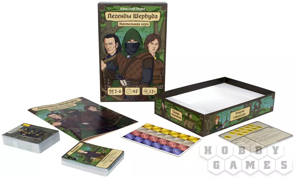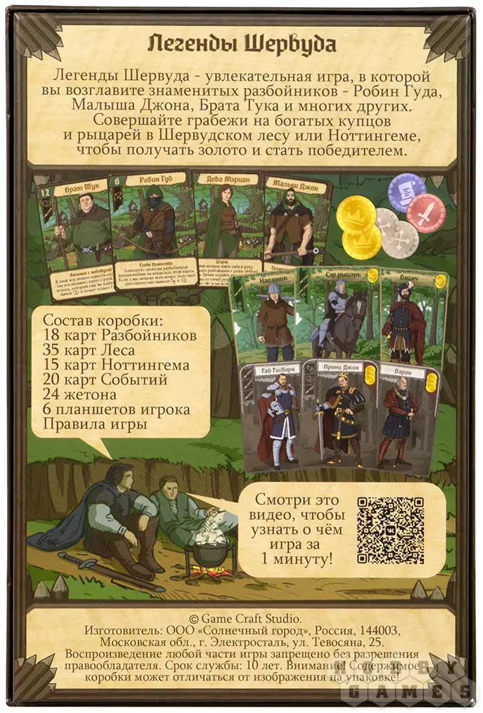 "Легенды Шервуда" – это карточная настольная игра по мотивам приключений благородного разбойника Робина Гуда: вместе со своими стрелками он грабил богатых путников, чей маршрут пролегал через чащу Шервудского леса, а затем раздавал награбленное нуждающимся. В этой игре вам так же предстоит возглавлять набеги на богатых путников, которые осмелились ступить в ваш лес. А ещё вы будете веселиться в тавернах и охотиться на диких животных. Сделайте всё, чтобы скопить как можно больше золота, ведь первый, кто соберёт 15 золотых монет, станет победителем!