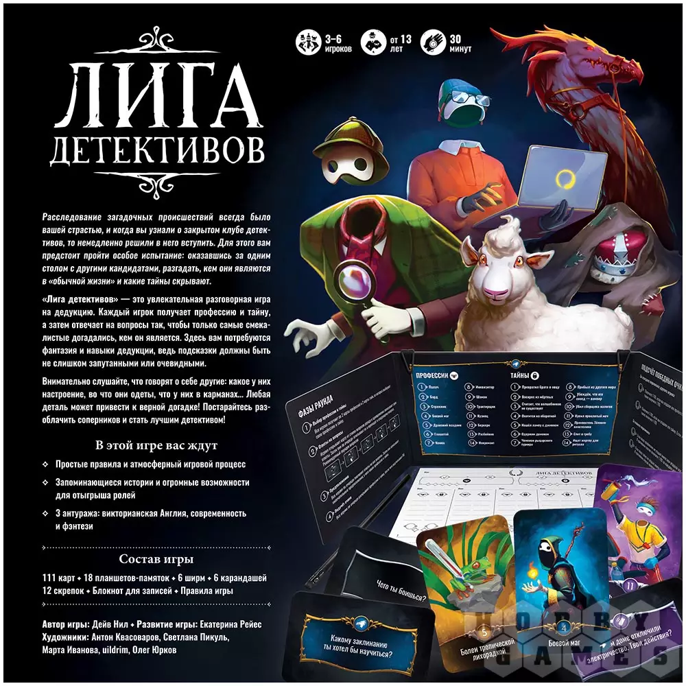 "Лига детективов" – это новая игра от издательства Hobby World, которая отлично подойдёт, чтобы весело провести время в большой компании. В ходе игры вам предстоит создавать собственные детективные сюжеты, увлекательные и неповторимые, отыгрывая роль героя одной из нескольких вселенных. Вас ждут сеттинги Викторианской Англии, современности и магического средневековья – по четырнадцать профессий и тайн в каждом наборе. Станьте программистом, информирующим спецслужбы, или палачом, одержимым демоном – и не дайте другим обнаружить скелета в своём шкафу.