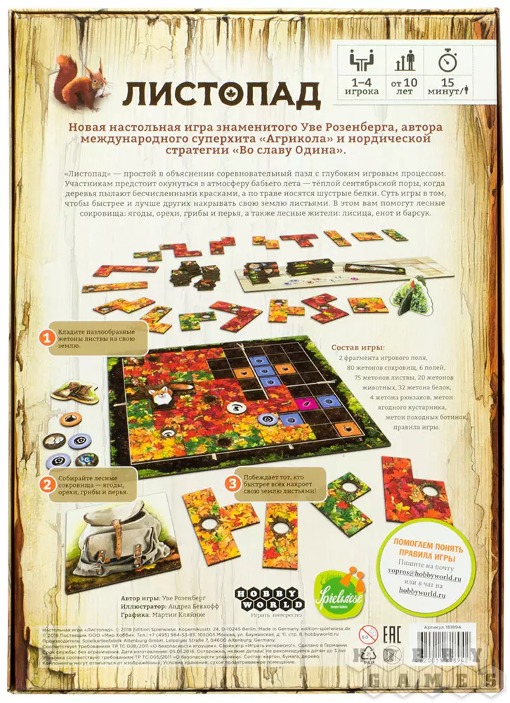 Настольная игра "Листопад" – это логическая игра-головоломка для 2-4 игроков, но при желании в неё можно играть и самостоятельно, как в пазл. Это очень уютная и "ламповая" игра на осеннюю тематику призвана скрасить вам не один вечер. За счёт простых правил в неё могут играть и дети, и взрослые, что превращает "Листопад" в семейную игру. Также её можно использовать и в качестве развивающей игры, ведь, чтобы преуспеть в ней, вам потребуется быть внимательным и расчётливым.
