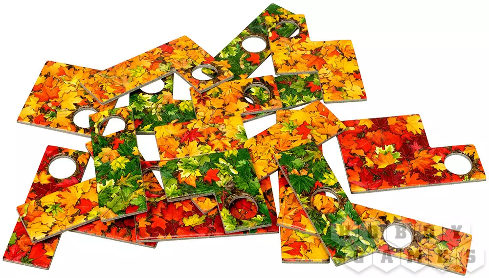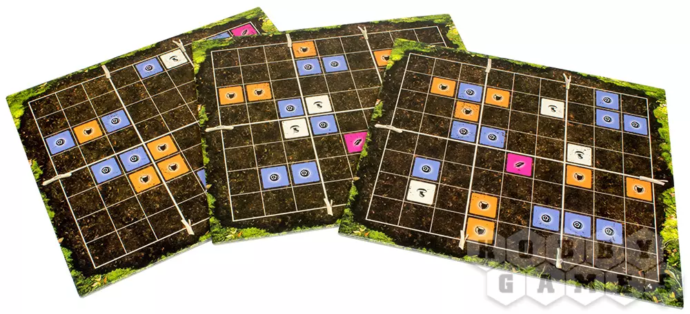 Каждый игрок получает по планшету земли, разбитому на шесть секторов, а всё пространство в целом разлиновано на клетки. На некоторых клетках изображены сокровища. Ваша задача на игру – заполнить всё свободное пространство жетонами листвы, белок и животных. Каждый жетон обладает своей формой, причём на некоторых из них присутствуют отверстия.