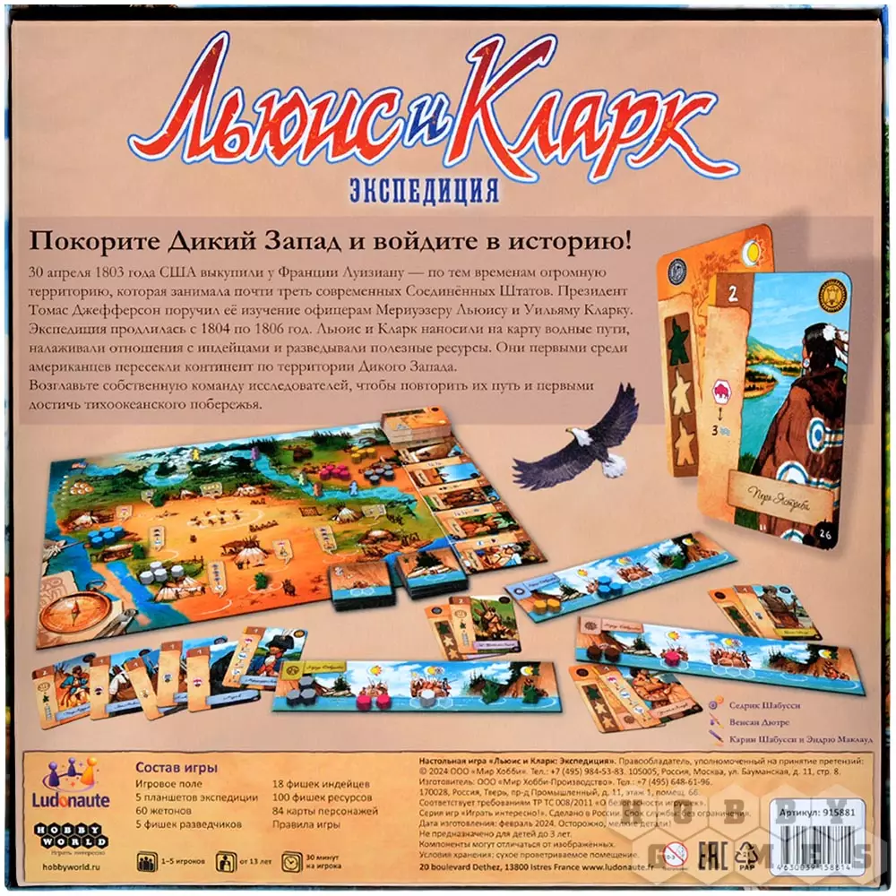 В настольной игре "Льюис и Кларк: Экспедиция" вы станете главой собственной команды исследователей и сможете повторить успех двух именитых офицеров. Прокладывайте свой путь по стопам Льюиса и Кларка, находите месторождения ценных ресурсов, открывайте водные маршруты и заручайтесь поддержкой индейцев, чтобы первыми добраться до тихоокеанского побережья!