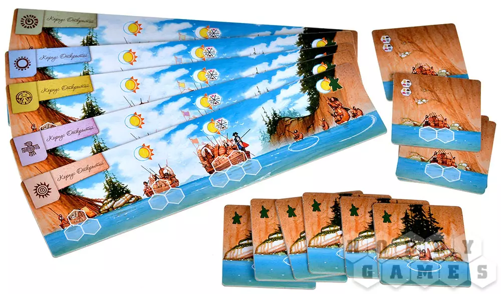 И в первом, и во втором случае потребуется потратить фишки индейцев из личного запаса для оплаты действия. Используя карты персонажей вы сможете добывать базовые ресурсы, такие как древесина, еда, снаряжение и мех, получать новые фишки индейцев, а также осуществлять движение по маршруту. В поселении же вас ждут более интересные действия: