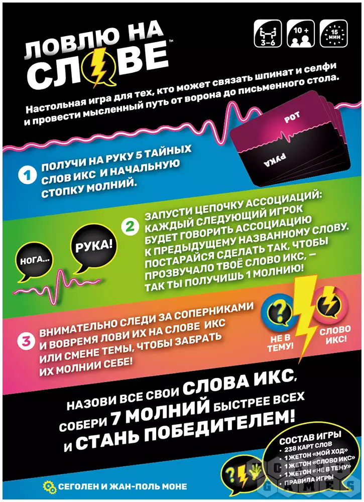 "Ловлю на слове" – это настольная игра, в которой вам нужно будет выстраивать цепочки ассоциаций, при этом внедряя в них свои "икс-слова" так, чтобы никто не заподозрил подвоха. Сможете, и получите молнию, а это крайне полезно, ведь итоговая цель – собрать 7 молний! Внимательно наблюдайте за соперниками и не стесняйтесь подлавливать их на слишком очевидной смене темы и попытке внедрить своё слово икс – так вы сможете украсть их молнии и ещё быстрее приблизиться к победе!