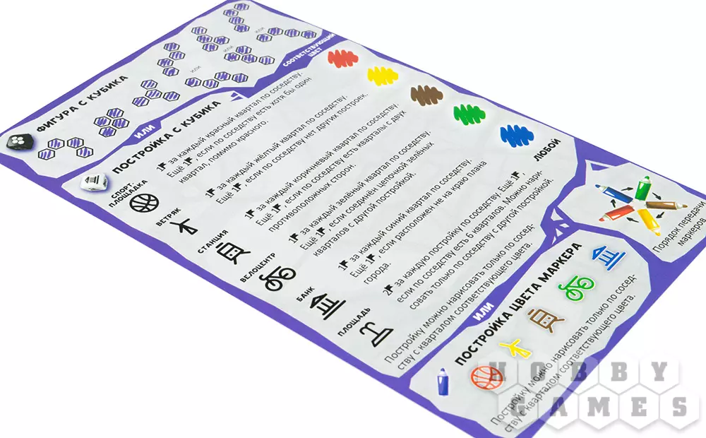 Для застройки игрокам пригодятся входящие в состав игры маркеры и блокнот: планирование будет происходить именно здесь. Стройте кварталы определённой формы и цвета, располагайте по соседству подходящие постройки, доступные в этом раунде и получайте за это победные очки и бонусы. Доступность форм кварталов и построек определяется бросков кубиков (базовые постройки можно нарисовать всегда, всё что для этого нужно – маркер правильного цвета), а маркеры переходят из рук в руки каждый ход.