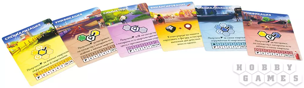 Получается, основная задача игрока – адаптироваться к ситуации и максимально эффективно планировать городское пространство, исходя из доступных конкретно сейчас возможностей. При этом здание может принести разное количество очков: это зависит от того, как оно расположено.