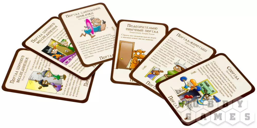 Внутри вы найдёте 16 новых карт порталов и 20 карт подземелий нового формата. Карты порталов замешиваются в колоду дверей и так или иначе взаимодействуют с колодой подземелий. Всё очень просто и дико интересно!