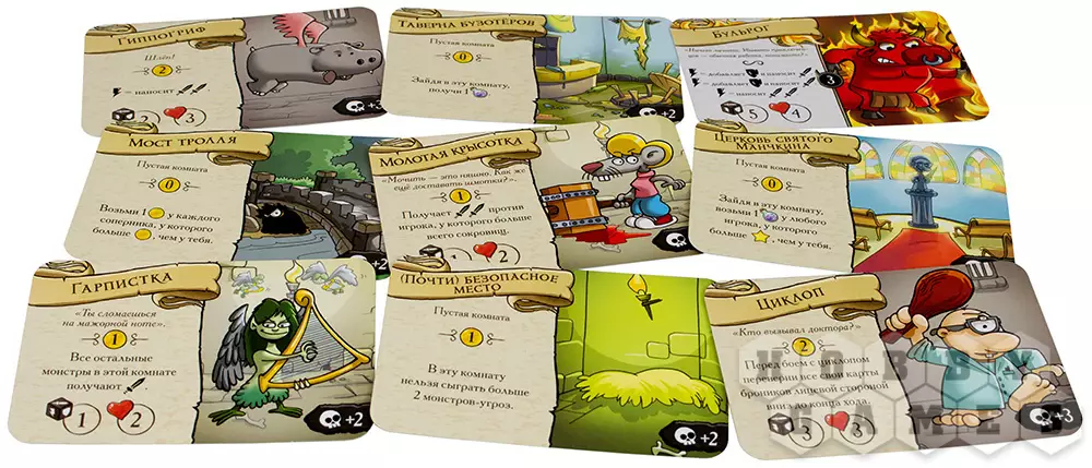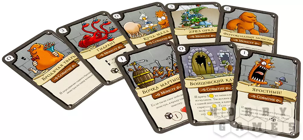 Неприятности сыпятся как из ведра! Каждый игрок может подкинуть вам проблем в комнату и помешать её зачистить. Соперники могут договариваться для создания совершенно безумных планов, которые нарушат любые ваши задумки, играть карты событий, призывать монстров и двигать бродячих монстров из других комнат.