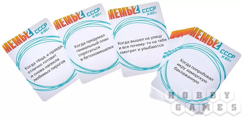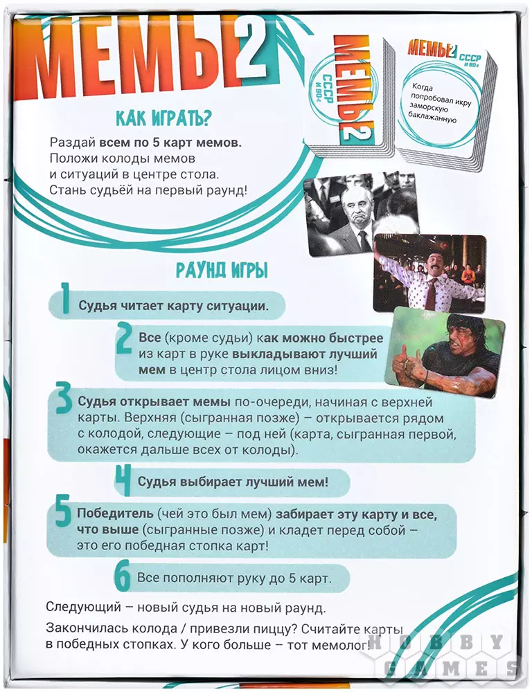 Правила игры "Мемы-2: СССР и 90-е" настолько просты, что объяснены прямо на коробке! В начале раунда ведущий зачитывает одну ситуацию – она может быть смешной, злободневной, неловкой или какой-либо ещё. Следом каждый игрок должен выложить из руки по одной карте мема, который, согласно его мнению, подходит для озвученной ситуации. Когда игроки закончат, ведущий выбирает лучший мем, а его автор получает часть оставшихся карточек в качестве трофеев. Тот, у кого стопка трофеев в конце игры окажется наиболее внушительной, получает почётное звание главного мемолога вашей тусовки!