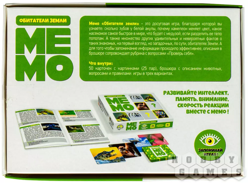 В игре "Мемо "Обитатели земли" вы найдёте парные карточки с изображением различных представителей фауны, населяющих нашу планету. Хамелеон, колибри, орангутан, скунс и страус – изучайте животный мир, сидя за игровым столом! Также в коробке вас ждёт брошюра с подробным рассказом про каждого животного, представленного в игре. Описание организма, среды обитания, образа жизни и многого другого – каждый сможет узнать что-то новое, а также после прочтения проверить себя, ответив на несколько вопросов в конце каждого пункта брошюры.
