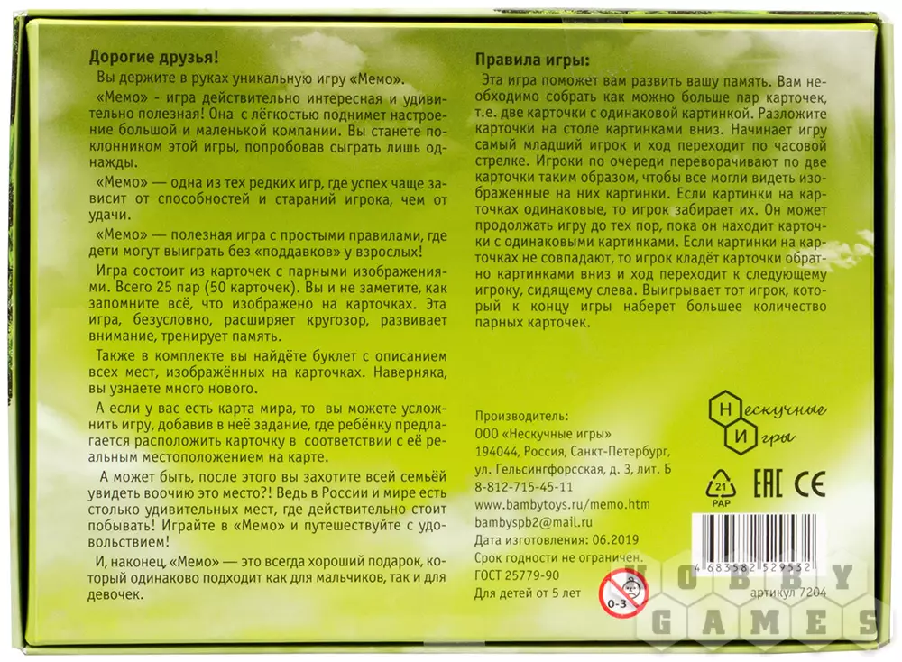 Перед вами "Мемо" – настольная игра для всей семьи. Эта игра на самом деле интересная и, что немаловажно, удивительно полезная! Вечер в большой или маленькой компании с такой игрой пролетит незаметно! Наверняка, вы станете поклонником "Мемо", сыграв всего лишь раз.