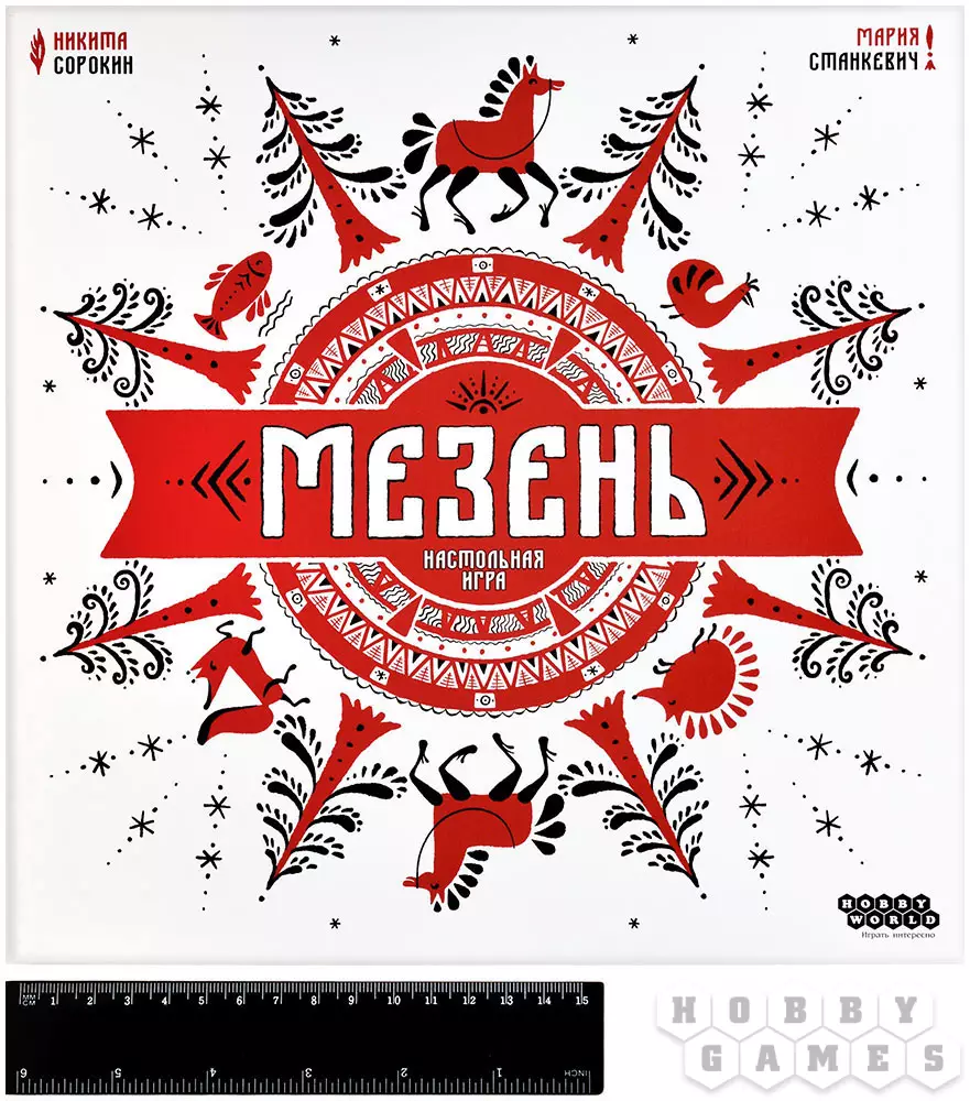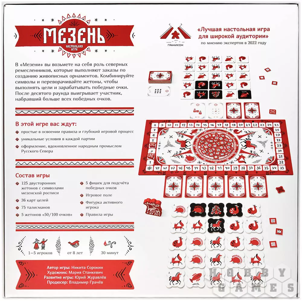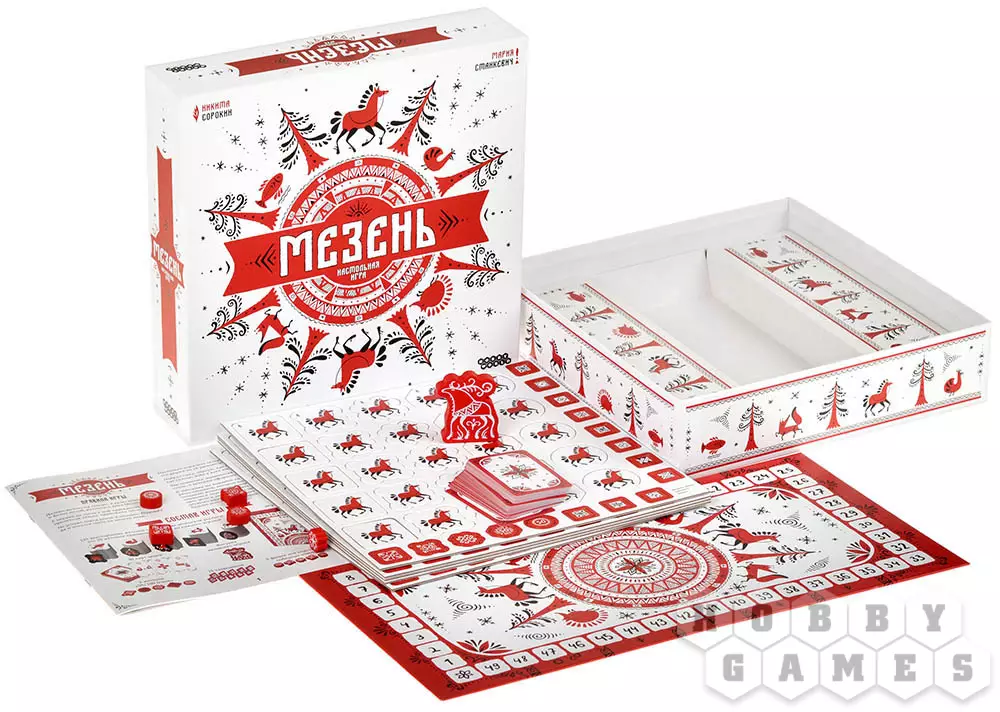 Игра "Мезень" основана на культурных мотивах и стиле мезенской росписи, что получило отражение во всех компонентах – от карт до поля и жетонов. Игроки возьмут роли северных ремесленников, что соревнуются в создании прекрасных орнаментов. Выполняя заказы из раунда в раунд, вы будете составлять комбинации из символов зверей, получать очки и использовать талисманы, чтобы стать самым известным мастером!