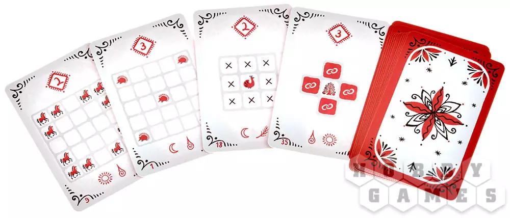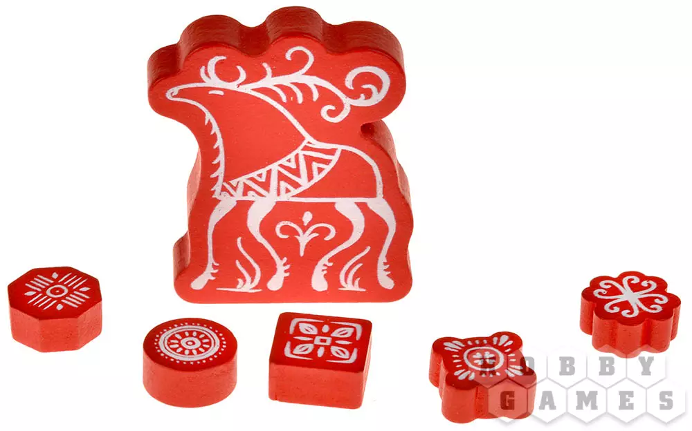 Каждый игрок получает набор из 25 жетонов с различными символами – от ежей до лошадей. Из данных жетонов случайным образом нужно выложить квадрат 5х5 – это орнамент игрока. Следом нужно открыть первые карты целей – с каждым раундом они меняются. Выдайте одному из участников фигурку активного игрока. Далее игроки получают по 5 талисманов – и можно начинать.