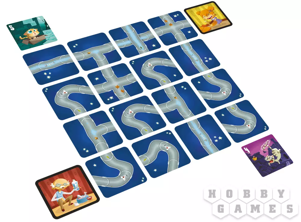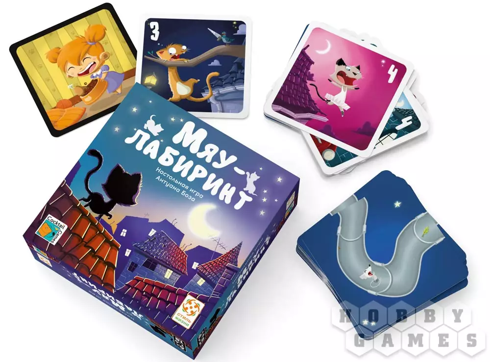 "Мяу-лабиринт" – это настольная игра на логику, выполненная в формате лабиринта. Вы должны будете сдвигать, поворачивать и докладывать карточки улиц так, чтобы показать котикам путь к гостеприимному дому. А если вам наскучит стандартный вариант игры, можете разнообразить игровой процесс: сыграть в гордом одиночестве в кошачий пасьянс или опробовать кооператив!