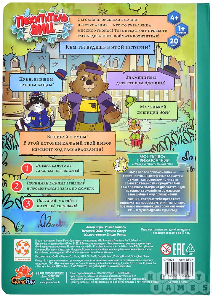 Перед вами увлекательная книга-игра "Похититель яиц" из серии "Моё первое приключение", рассчитанной на юных фантазёров, любящих волшебство и приключения. Достаточно только взять книгу в руки и выбрать себе персонажа – и погрузиться в мир чтения! Но непростого, ведь сюжет будет меняться в зависимости от ваших действий. Принимайте решения, делайте выборы и открывайте различные концовки – и, конечно же, лучшую из них!