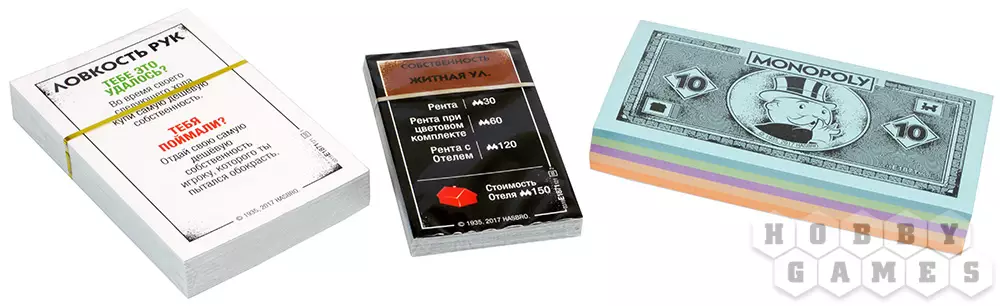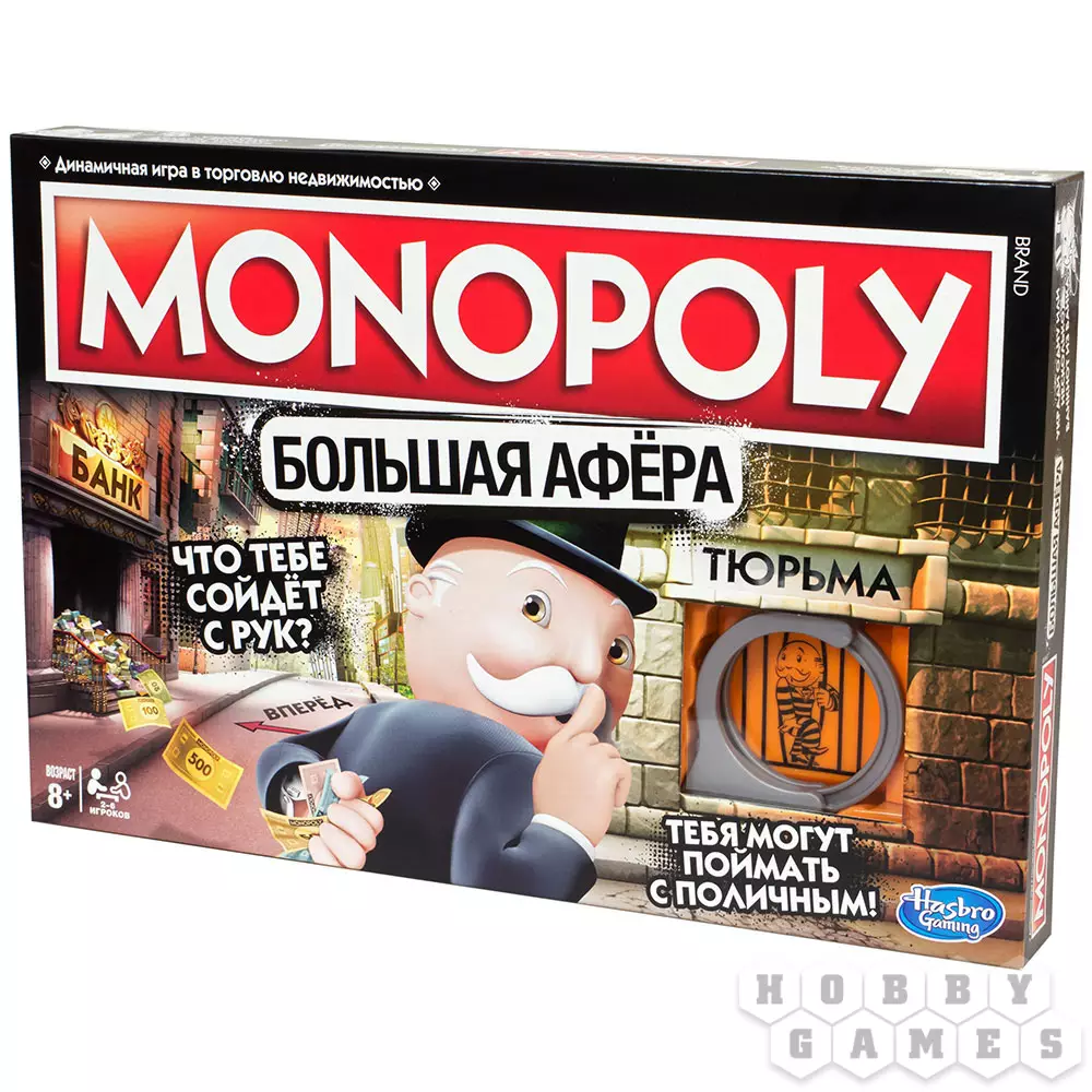 В настольной игре "Монополия: Большая афера" помимо классических карточек с наименованиями зданий и строений вы найдёте новые уникальные карточки. Так, например, карты "Афера" предлагают тайком нарушить правила и смухлевать в свой ход. Для этого, вероятно, придётся отвлечь игроков, использовать ловкость рук или пойти на обман, но, если всё получится, афериста ждёт заслуженная награда. Если же другие игроки были начеку и раскрыли мошенничество, то обманщик заплатит штраф и отправится в тюрьму, а это значит, что придётся в буквальном смысле примерить на себя наручники, входящие в комплект игры. Конечно, всегда можно попробовать оправдаться и избежать наказания, но это весьма непросто.