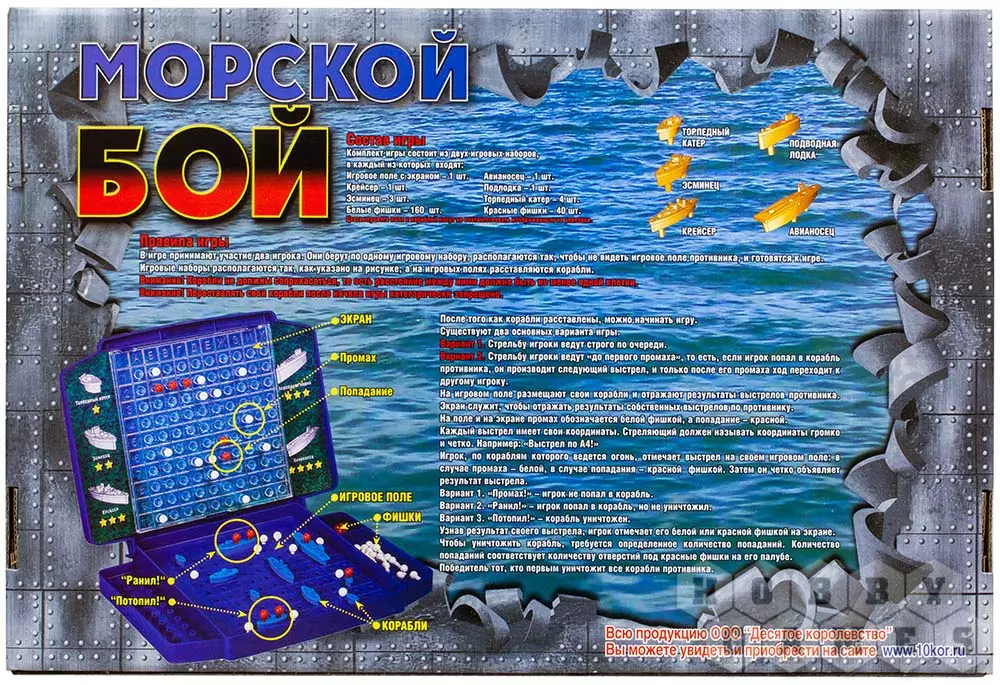 Правила игры остались неизменными – соперники располагают свои корабли на игровом поле, и по очереди стреляют по флотилии противника точечными ударами. Белыми фишками, входящими в комплект, на поле отмечаются промахи, красными – успешные попадания.
