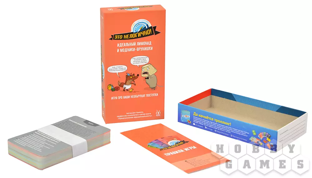 "Это нелогично! Идеальный лимонад и модники-врунишки" – это карточная настольная игра, основанная на настоящих социологических исследованиях. В коробке 63 карты, вам и вашим друзьям предстоит проанализировать ситуации, описанные на карточках, и постараться понять, как повело себя большинство участников исследования: четыре варианта ответа на один вопрос. Трижды ошиблись? Увы, вы проиграли. Дали 5 правильных ответов – вы выиграли! Но если всё-таки трижды ошиблись, не расстраивайтесь и попробуйте ещё раз.