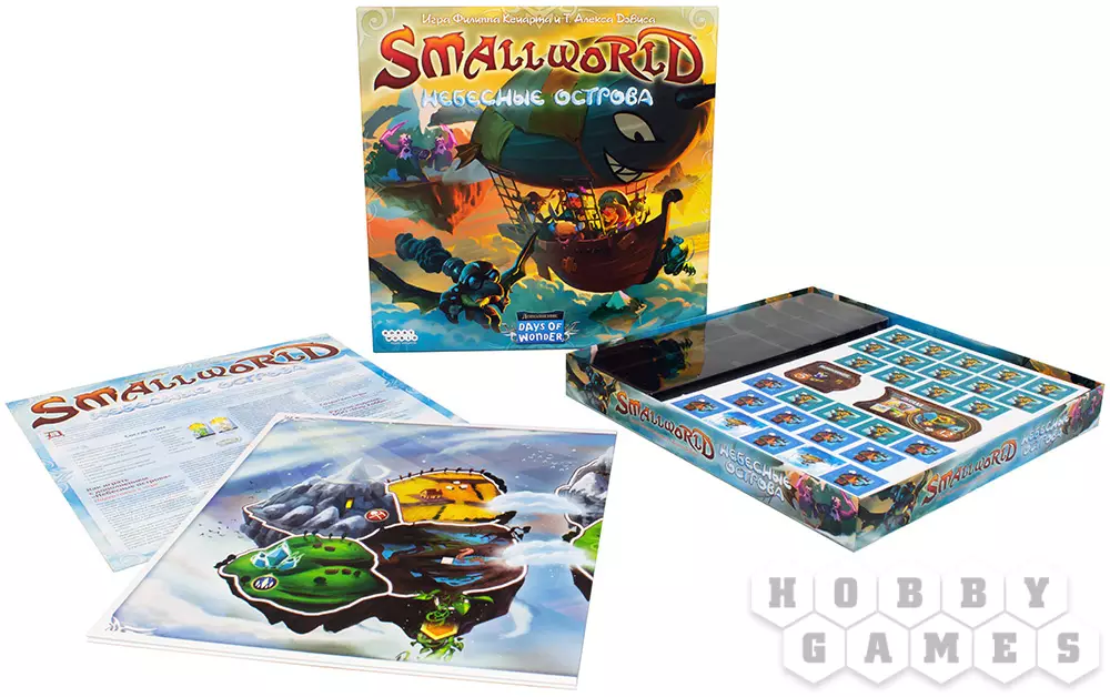 Партии в Small World станут ещё интересней и разнообразней вместе с дополнением "Небесные острова". Оформление выдержано в стиле базовой коробки и не раз заставит вас улыбнуться.