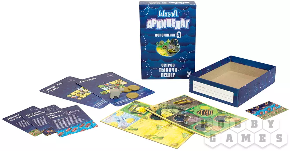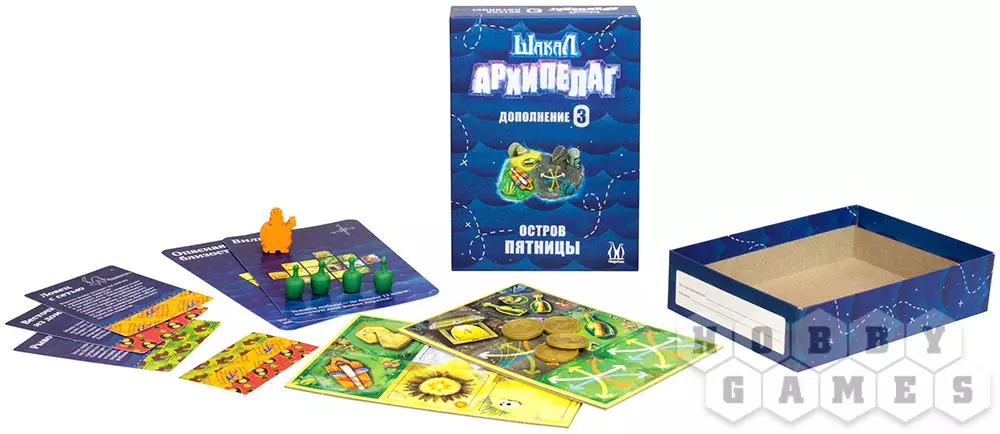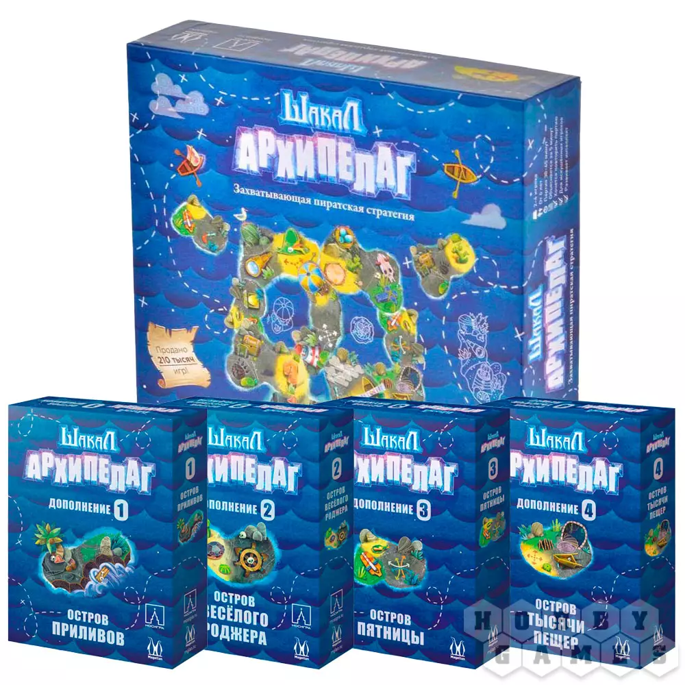 Набор включает в себя игру "Шакал Архипелаг", дополнение "Остров пятницы", дополнение "Остров Весёлого Роджера", дополнение "Остров приливов" и дополнение "Остров тысячи пещер" со скидкой 15%.