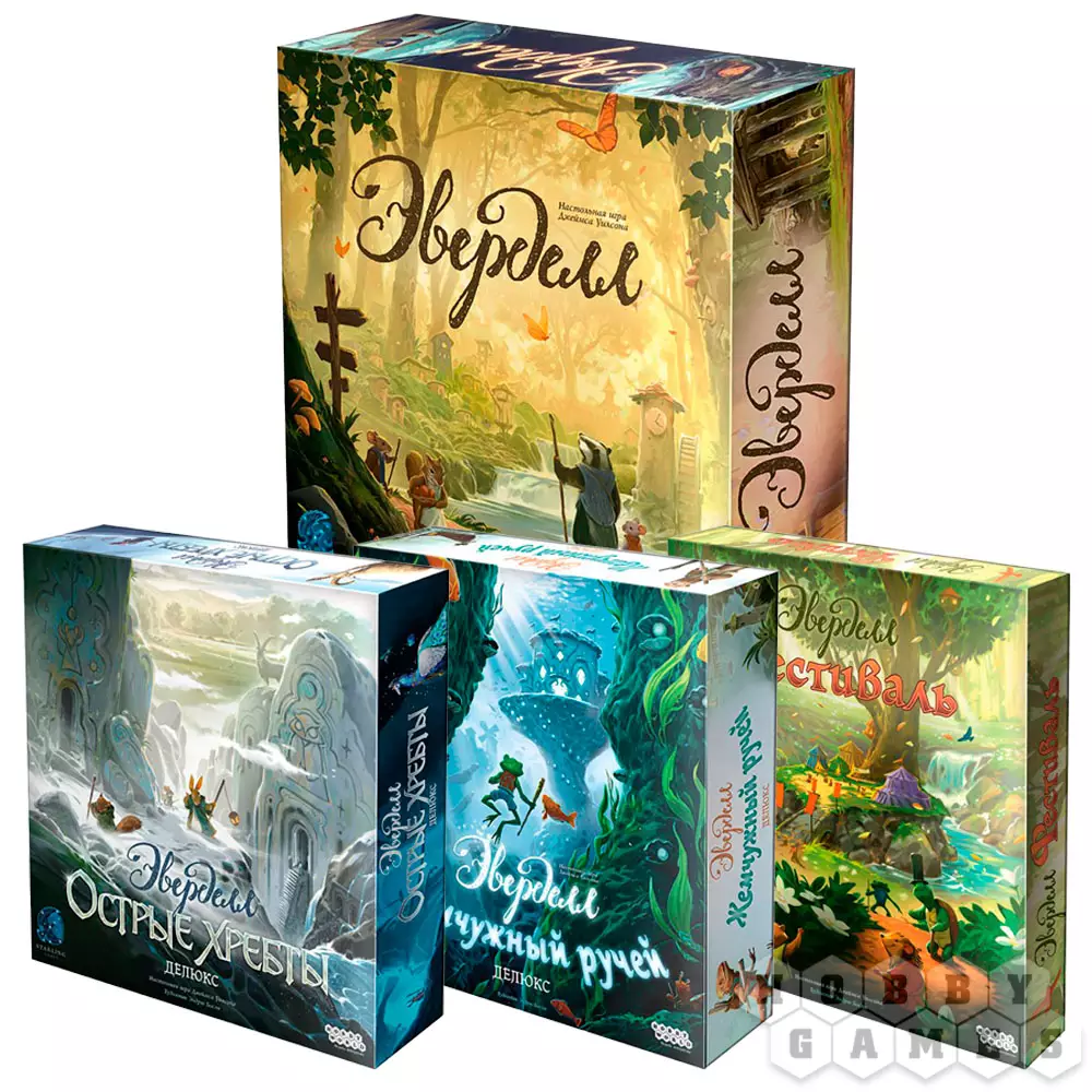 Набор включает в себя игру "Эверделл", дополнение "Эверделл: Жемчужный ручей. Делюкс", дополнение "Эверделл: Фестиваль", и дополнение "Эверделл: Острые хребты. Делюкс" со скидкой 15%.