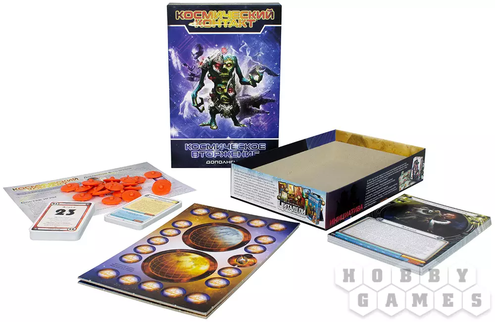 Дополнение "Космическое вторжение" добавляет в "Космический контакт" много нового и интересного контента! Во-первых, конечно, 20 рас – сильные и со своими особенностями. Одни повелевают временем и мечтают о переустройстве мироздания, другие просто ищут еду: каждый найдёт расу себе по вкусу. А играть с "Вторжением" можно будет и вшестером! Также теперь становится выгодно помогать игрокам, которые защищаются от вторжения, ведь в игру добавляется колода наград для союзников защитника, включающая карты импульсов и разломов.