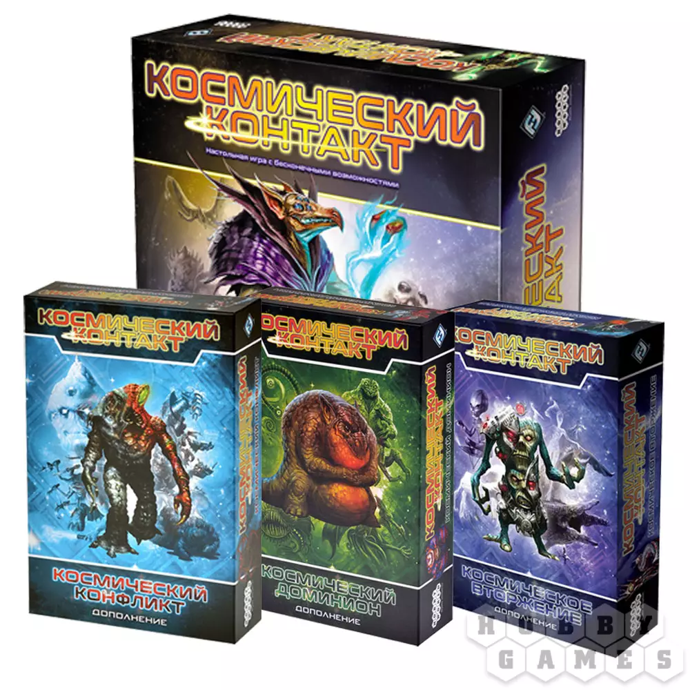 Набор включает в себя игру "Космический контакт", дополнение "Космический контакт: Космическое вторжение", дополнение "Космический контакт: Космический конфликт" и дополнение "Космический контакт: Космический доминион" со скидкой 15%.