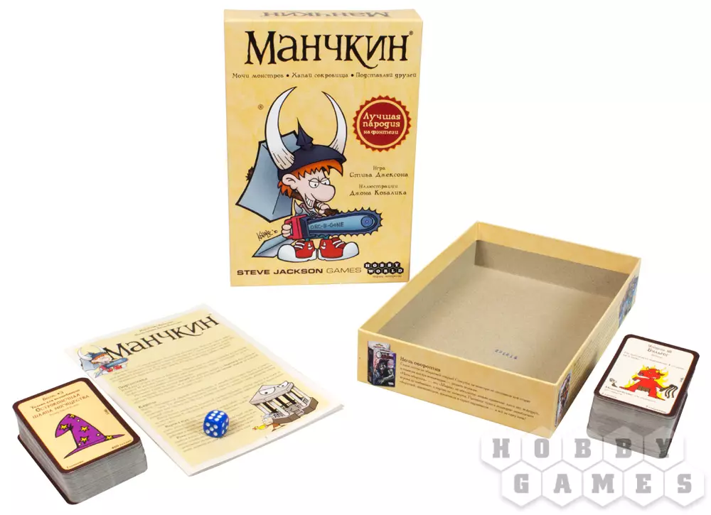 Ролевая игра по форме, пародия по содержанию. Манчкины игроков ходят по подземелью, вытаскивают на свет божий тамошних чудовищных обитателей и либо раскаиваются в этом, либо получают за победу новые уровни и сокровища. Исход каждого подобного приключения (боя, короче) зависит от того, кто с чем на бой вышел. У игрока это уровень и бонусы/штрафы от шмоток, класса, расы и проклятий. У монстра это уровень плюс карты-усилители и разовые шмотки. Откуда шмотки у монстра? В вашем бою могут принять участие и завистливые соперники: они могут помогать монстру и ослаблять вас. Поэтому, хотя в "Манчкин" и можно играть вдвоём, наберите на матч побольше народу: на руках будет больше проклятий, усилителей и зелий, которыми так легко изменить баланс сил в бою в любую сторону, и бдительные завистники не дадут никому из вас выйти в единоличные лидеры гонки к 10-му победному уровню.