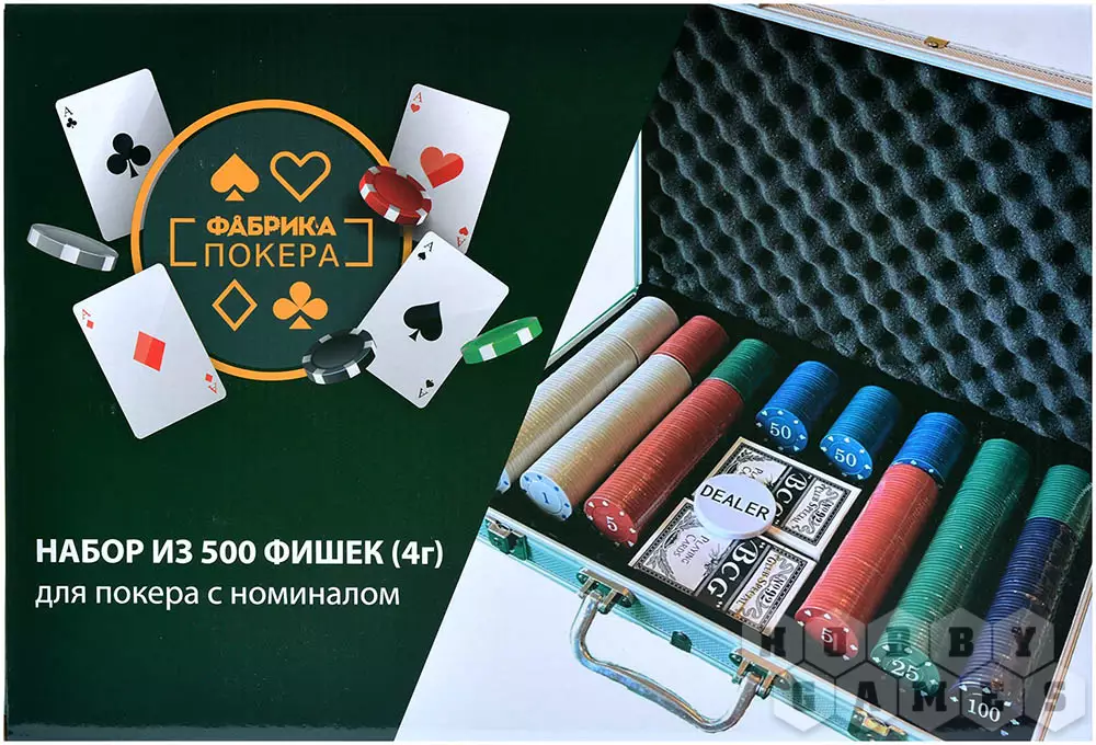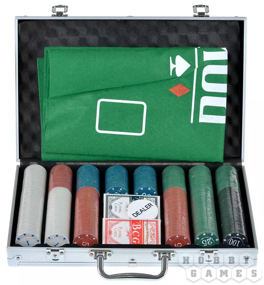 В данном комплекте вы найдёте всё необходимое для игры в классический покер. Внутри вы найдёте 500 стандартных фишек для профессиональной игры (4 гр.), фишку дилера, 2 колоды игральных карт, соответствующих качеству карт казино. Все компоненты убраны в элегантный и прочный алюминиевый кейс.