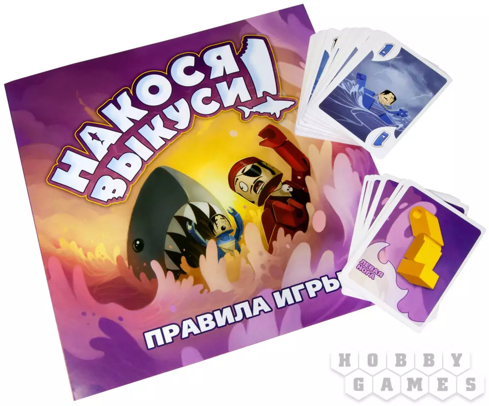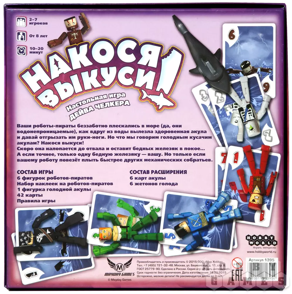 "Накося выкуси" – это быстрая динамичная игра для 2-7 игроков, которая придётся по душе и взрослым и детям. Водный антураж, забавные роботы-пираты и простые правила помогут скоротать время в поездке или разбавить семейный тихий вечер. В коробке вы также найдёте дополнение "Сыграй за акулу", с помощью которого один из игроков может принять сторону зла и стать акулой. Водные просторы ждут вас!