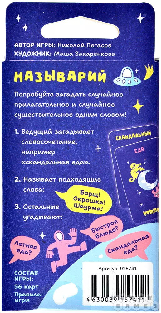 "Называрий" – это простая и весёлая игра, в которой вы должны одним словом загадать случайное прилагательное и случайное существительное. Если остальные игроки справятся с задачей за две минуты, то все участники получат заветные победные очки. На первый взгляд кажется просто, но ведущему придётся поднапрячься, чтобы суметь грамотно объединить два на первый взгляд несовместимых слова. Лёгкость, азарт и веселье – вот те слова, которые идеально описывают игровой процесс!